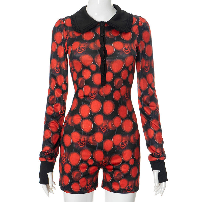 Mono de Halloween con diseño de globo y mueca de IA en color negro y rojo para mujer