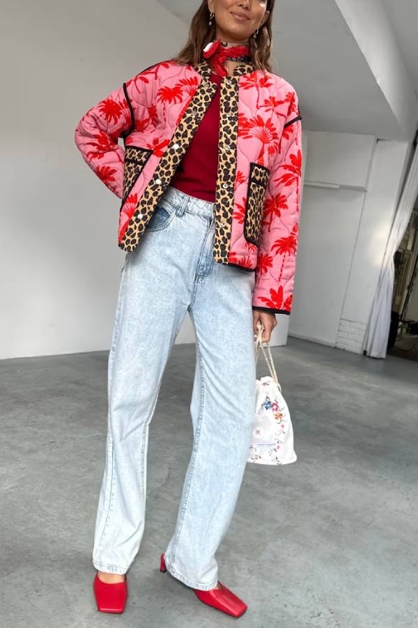 Dos preciosos estampados diseñados por nuestro equipo en tejido acolchado. Nuestro icónico estampado "Running Wild", con nuestros clásicos motivos de leopardo y palmeras, se transforma en un impresionante estampado de palmeras en rosa y rojo, con detalles de leopardo en los bolsillos, el cuello y la botonera. Infinidad de opciones de uso. Con un corte ligeramente oversize, combínalo con unos vaqueros festoneados en las estaciones más frías.