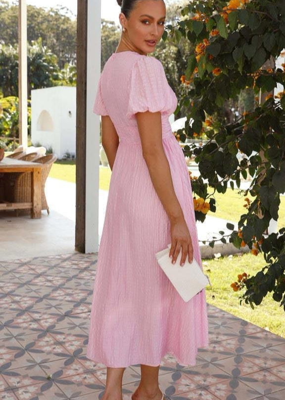 The Rosalie dress brings charm and refinement to warm-weather styling. Featuring soft puff sleeves and a flattering V-neckline, this button-front midi dress is tailored from a lightweight textured fabric that moves effortlessly. The smocked waistband defines your silhouette, while the flowing A-line skirt adds gentle movement.