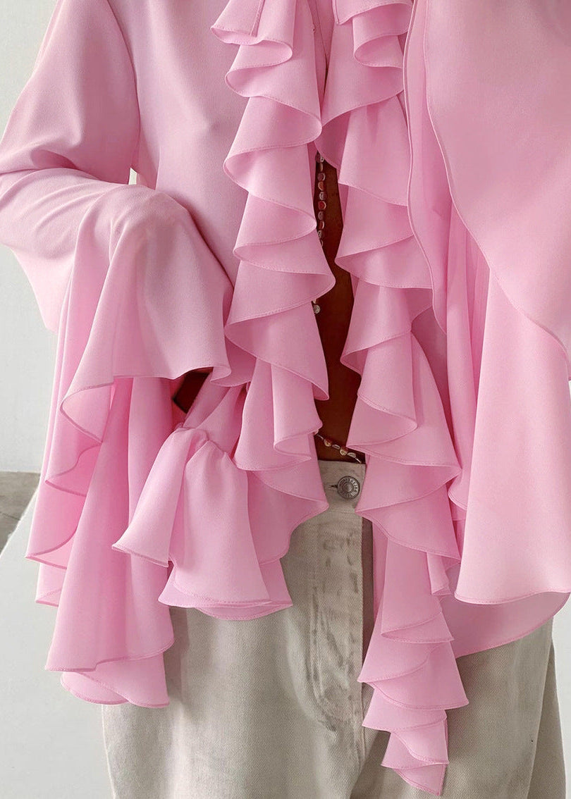 Rosalind Charm - Ruffled Statement Blouse is the ultimate blend of drama and elegance. Designed with cascading ruffles along the front and voluminous bell sleeves, this blouse exudes femininity and bold sophistication. The delicate high neckline with a bow detail adds a refined touch, while the open front allows for versatile styling. Crafted from a lightweight, flowy fabric, this standout piece is perfect for making a statement at any occasion. Pair it with tailoRed pants or denim for an effortlessly chic look.