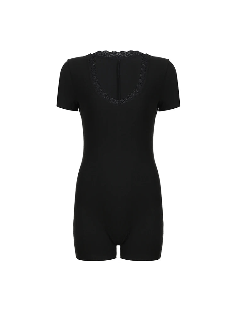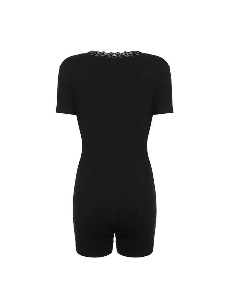 Mono ajustado de manga corta con cuello en V y ribete de encaje sexy para mujer