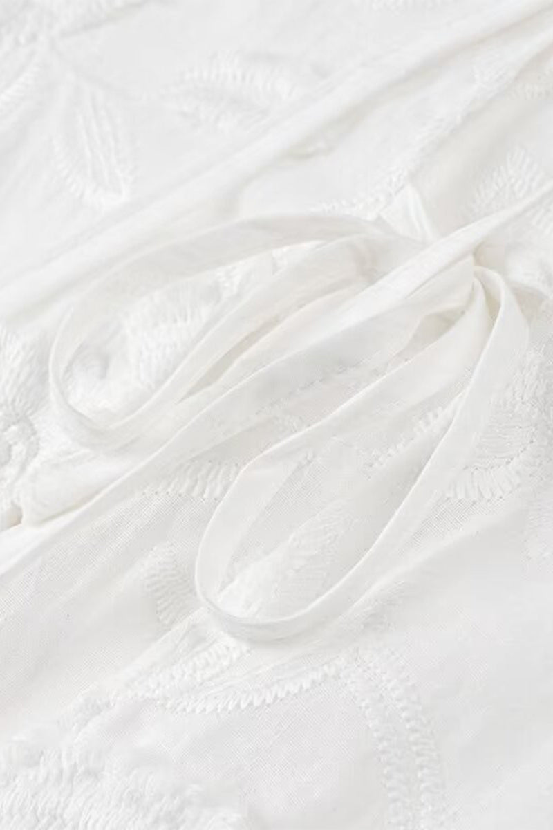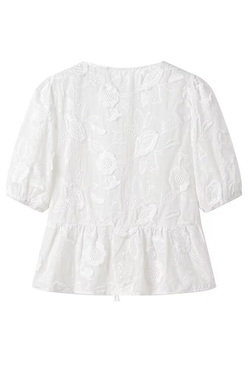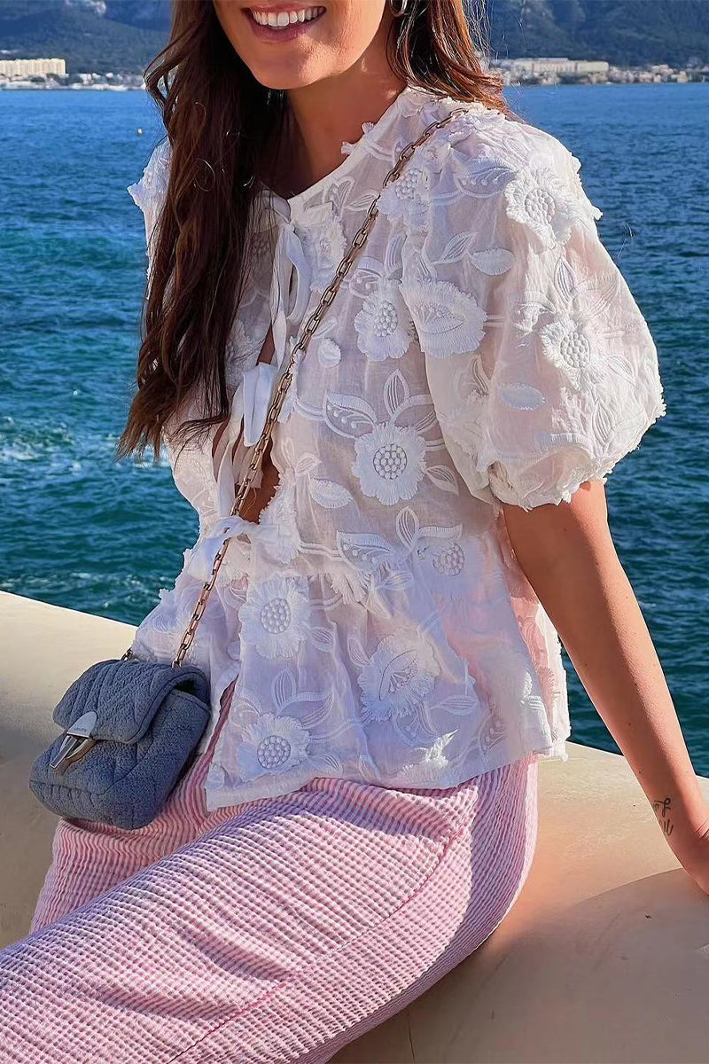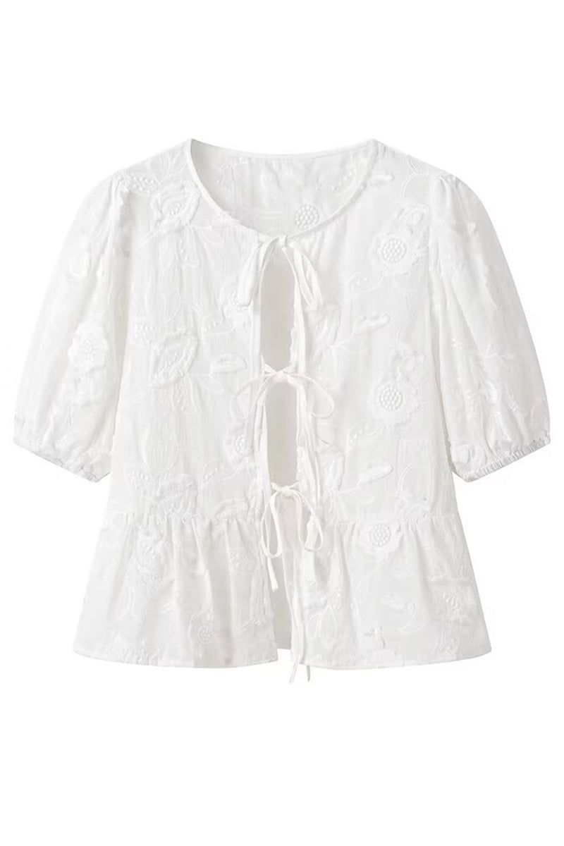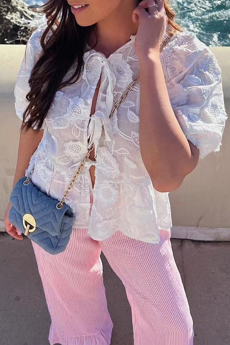 Dulce y elegante top de encaje sólido con frenillo y lazo en el cuello redondo
