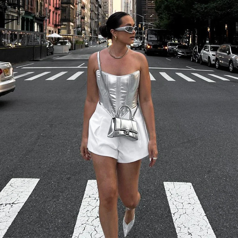 Chaleco metálico para mujer, top sexy ajustado con corsé, camisa de fondo, vendaje en la cintura, ropa de calle para chicas atractivas, primavera 2025