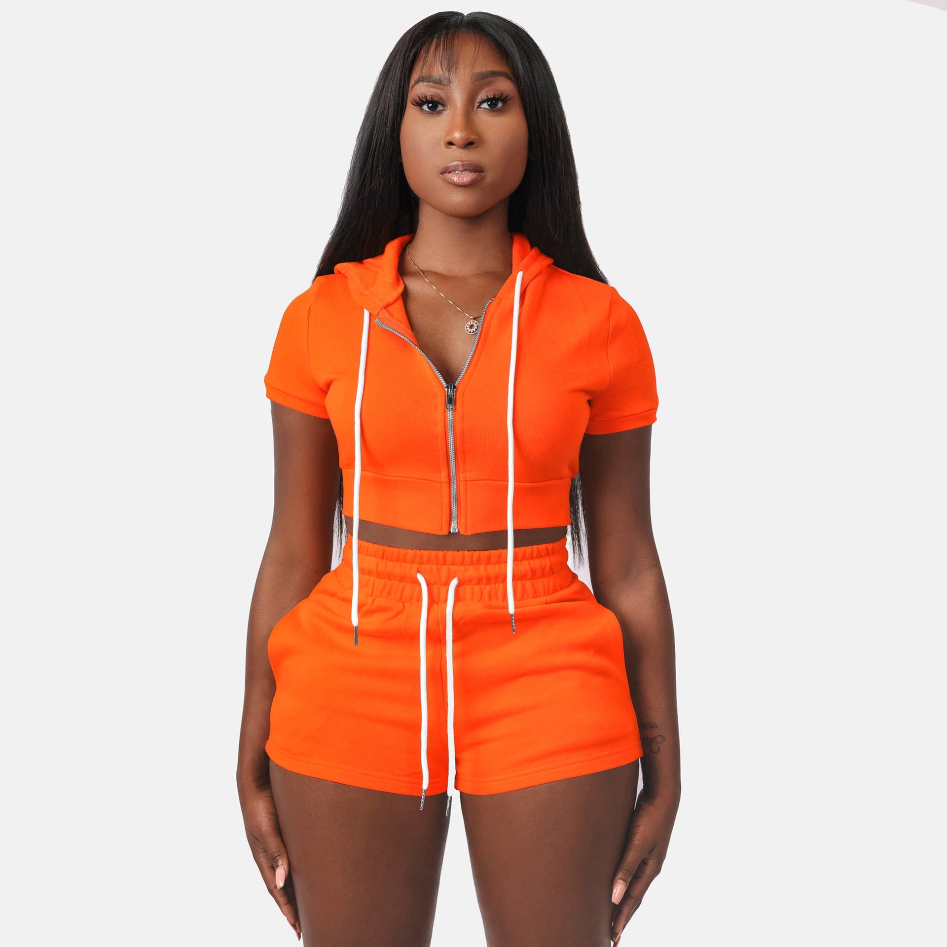 Conjunto de dos piezas con capucha, top corto y cremallera de color liso y cárdigan con cremallera para mujer