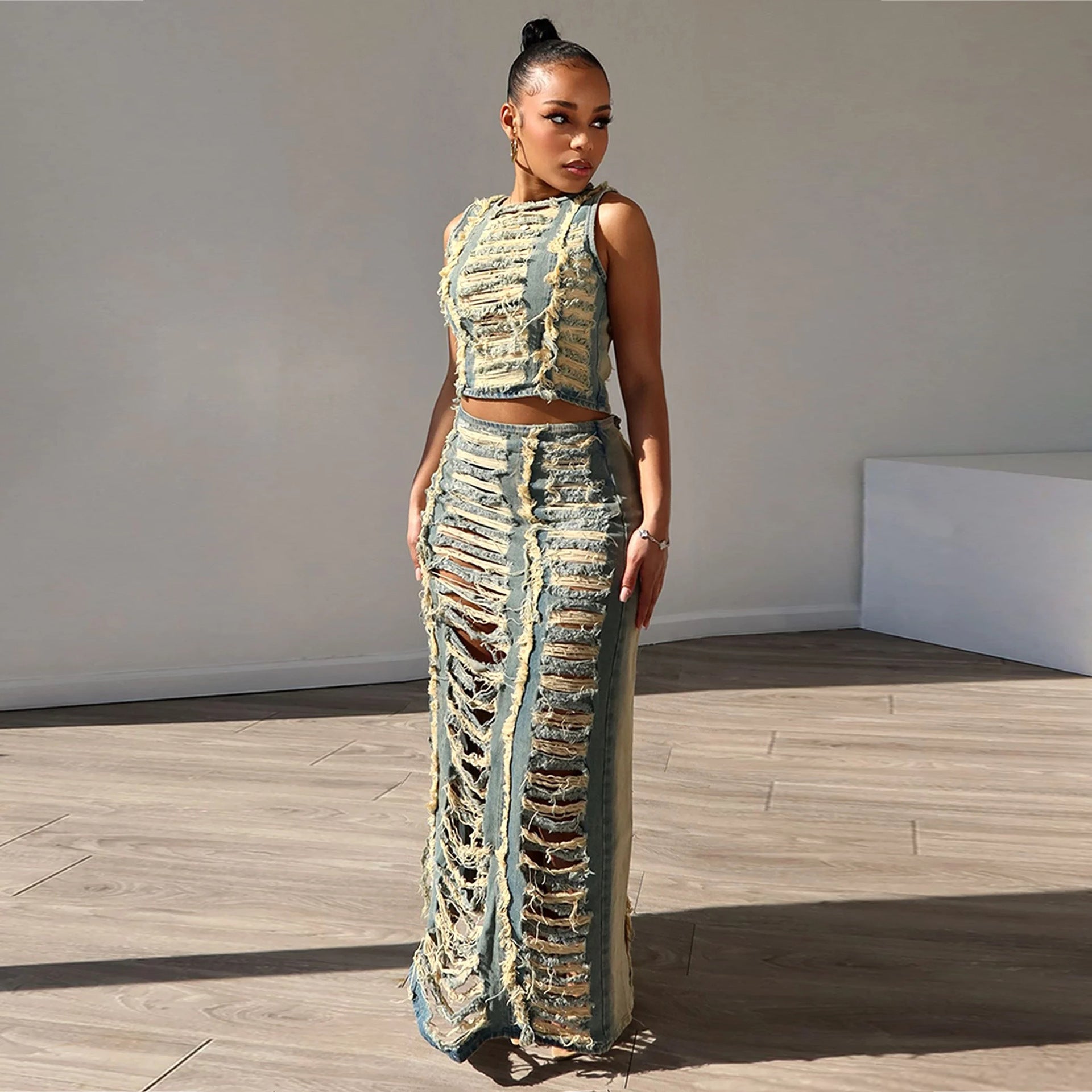 Traje de mezclilla para mujer, chaleco personalizado usado a mano, conjunto de falda de mezclilla con abertura alta