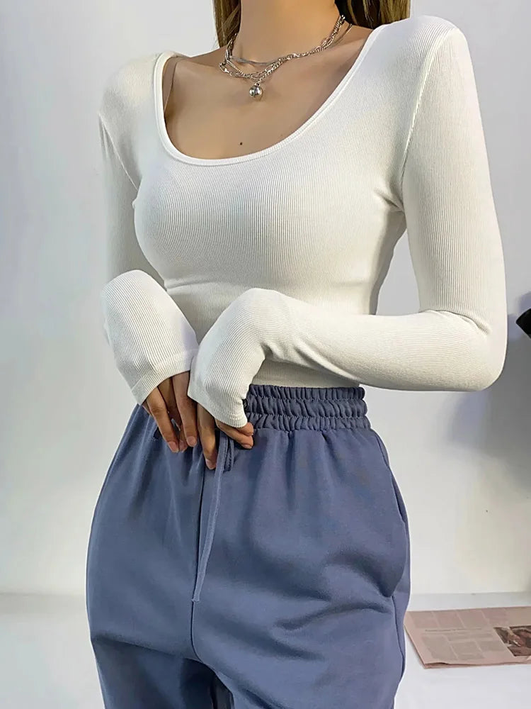 2025 Women Clothing Tops Fit Casual Elastic Cotton Solid O-neck full sleeve T-shirt