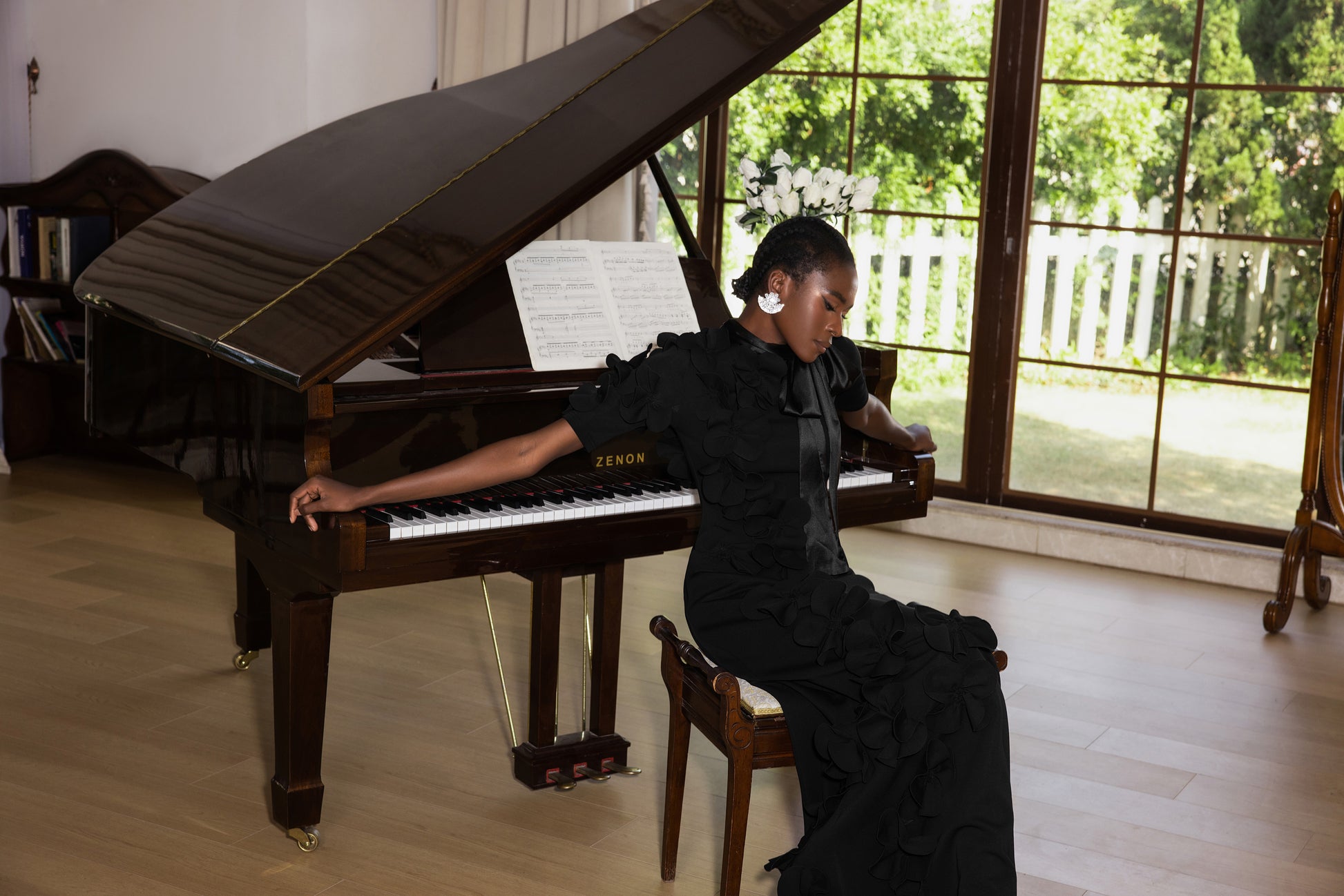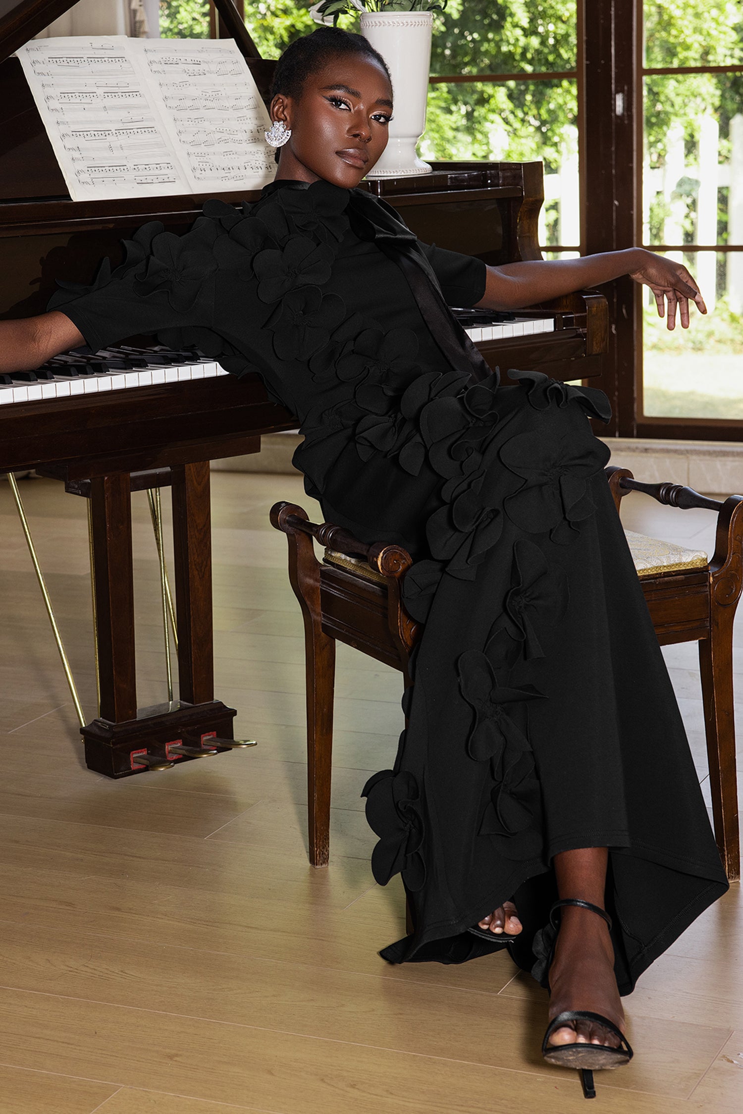 - Solid color, black, 3D flower, lace up, mid sleeve, maxi dress