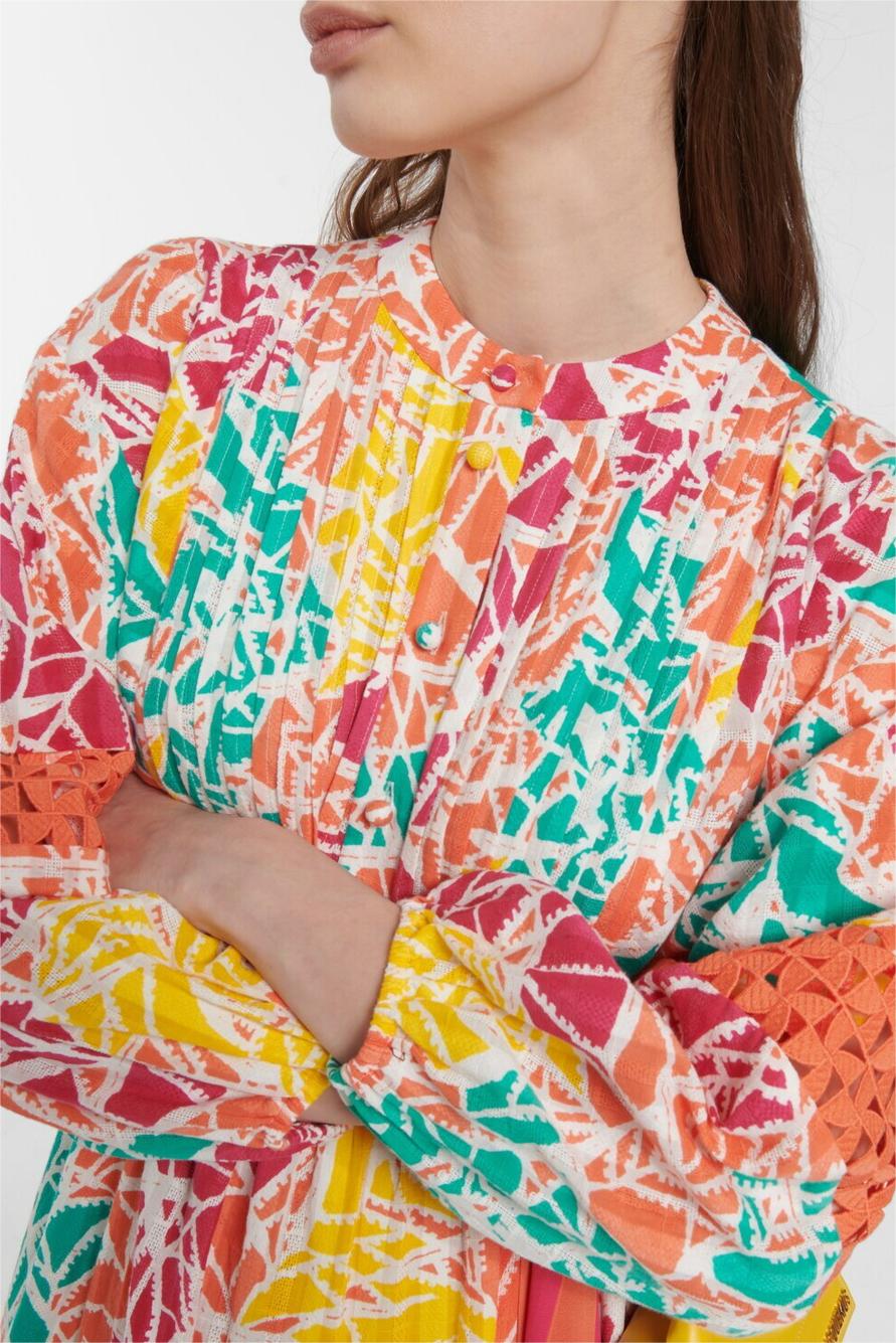 - Abstract print, lace, pleated, midi dress, belted, long sleeve