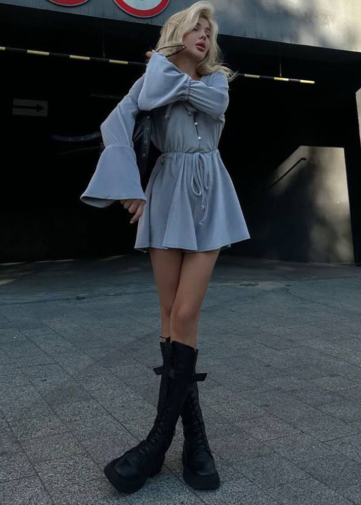 The Ashbell Tie Waist Romper offers a balance of comfort and structure with a soft draping fit and flared sleeves that add drama to the silhouette. Crafted in a muted gray tone, this mini jumpsuit features a cinched waist with a self-tie detail, button-down front, and wide bell cuffs with ribbon accents. Lightweight and breathable, it's ideal for transitional seasons, casual outings, or styled with chunky boots for an elevated streetwear vibe.