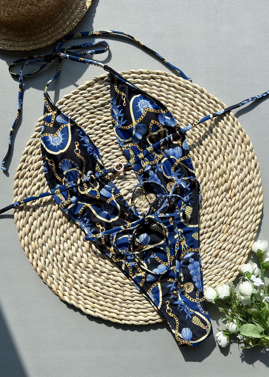 Aurelia - Deep Plunge One-Piece Swimsuit is a statement piece designed for bold, confident women. Featuring a daring deep V-neckline with a gold-tone accent at the center, this swimsuit enhances your silhouette with its sleek, figure-flattering fit. The adjustable crisscross back ties allow for a customizable fit, while the luxe chain print on a rich navy base adds a sophisticated edge. Crafted from soft, stretchy fabric, this one-piece offers both comfort and style, making it perfect for poolside lounging or glamorous beach days.