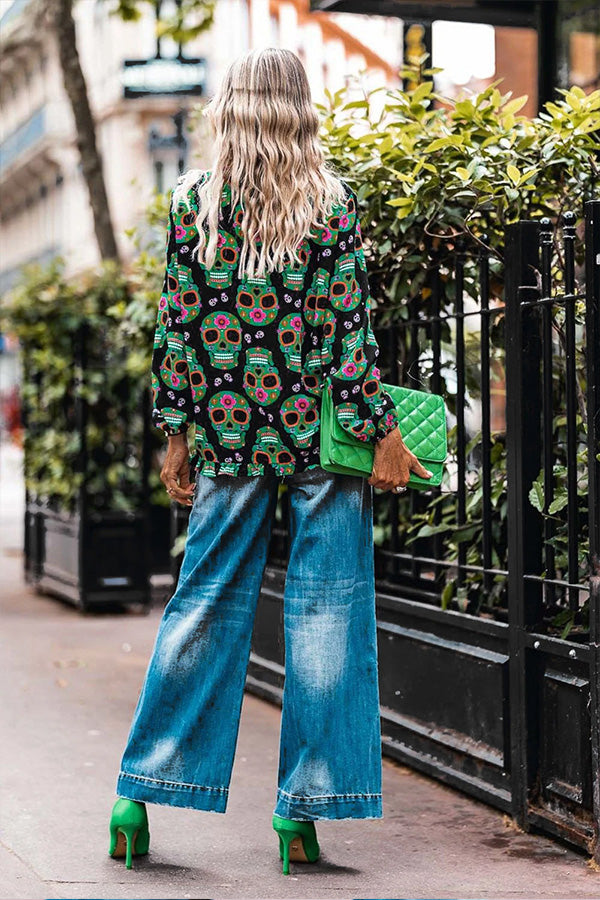 Black Halloween Flower Skull Babydoll Blouse