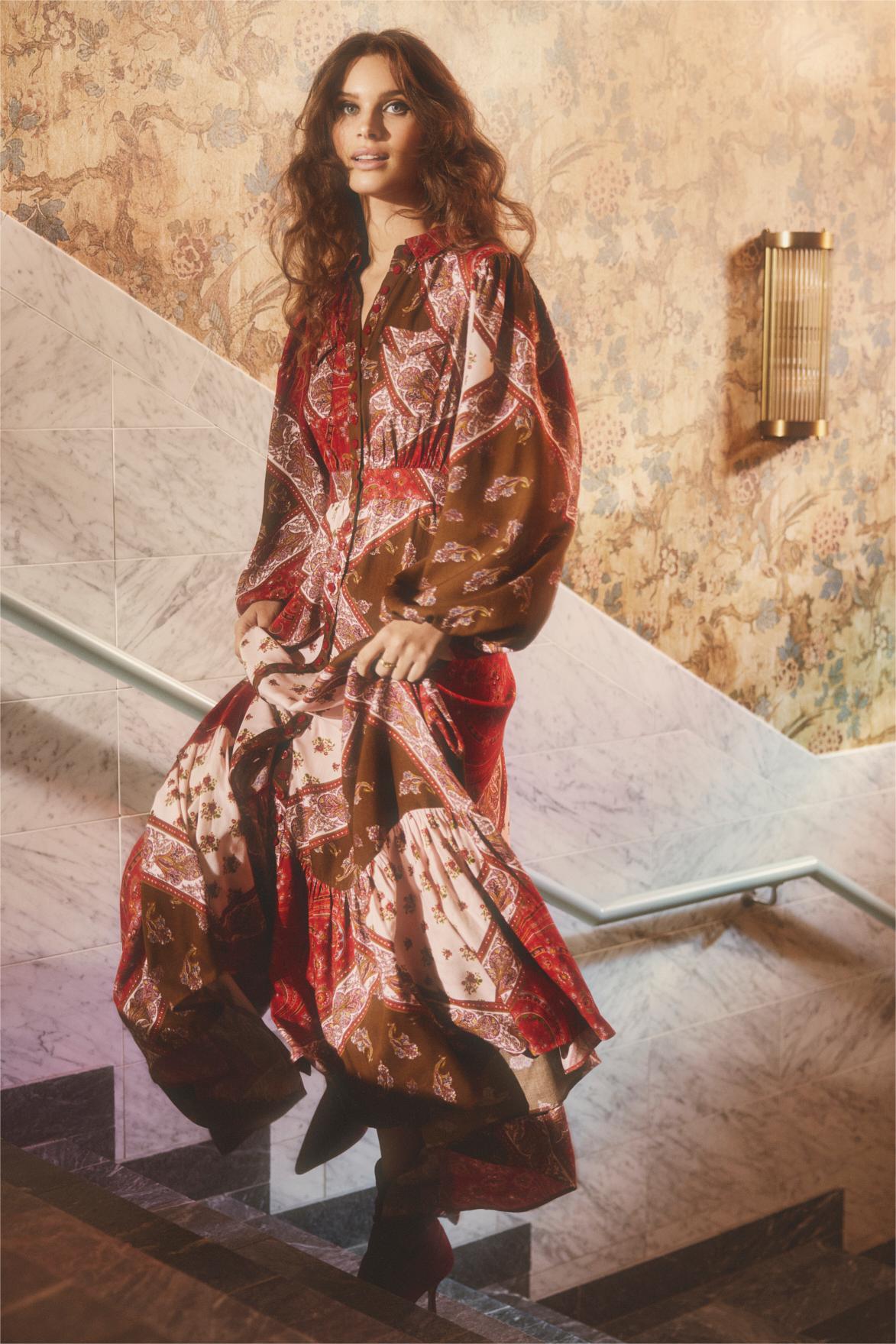 - Botanical print, lantern sleeve, long sleeve, midi dress, red, brown