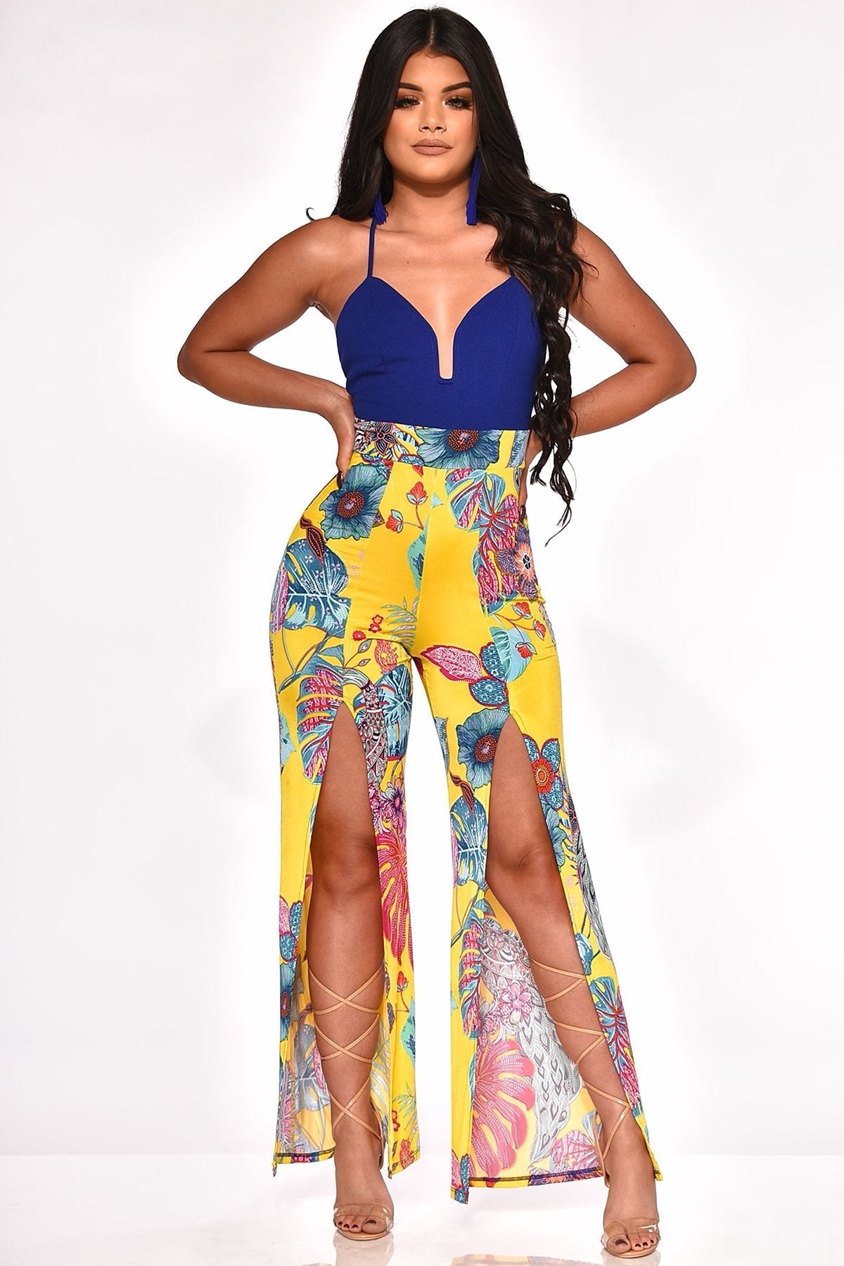 Boutique Sling Backless Slit Leaf Printed Jumpsuit