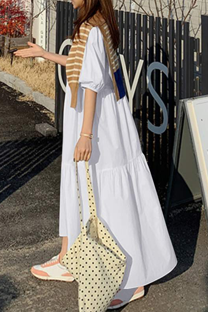 Casual Solid Patchwork Buttons O Neck Cake Skirt Dresses(3 Colors)