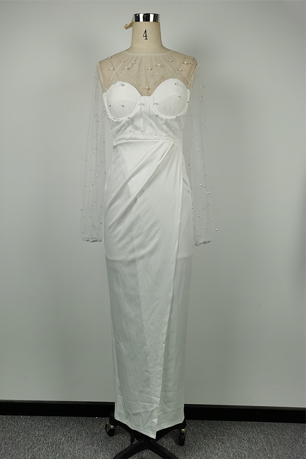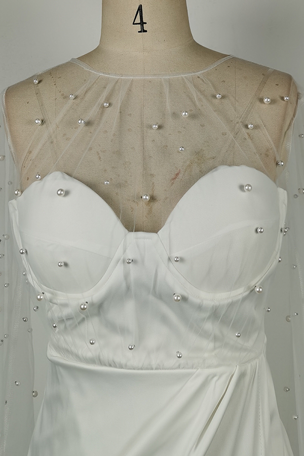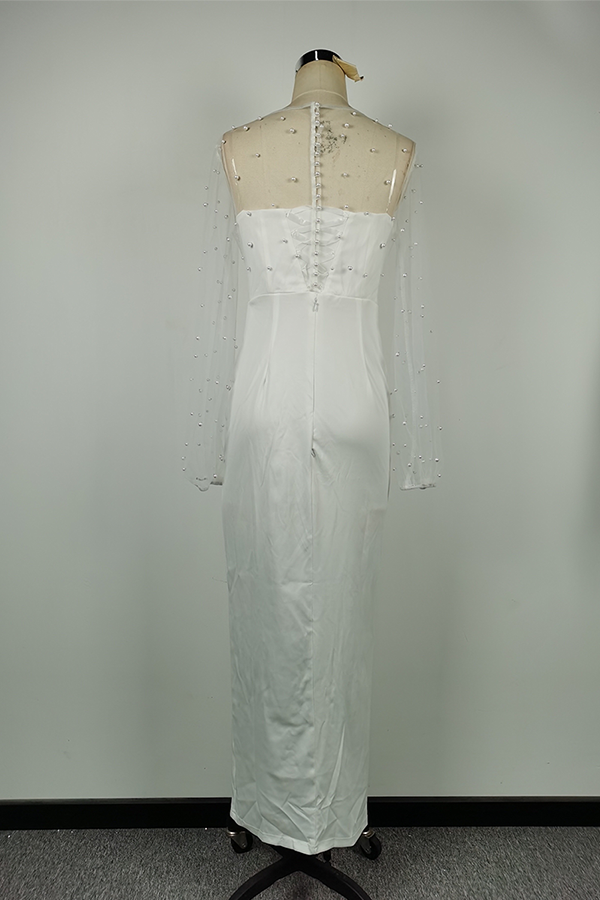 This is a slim fit solid color evening gown. Lace stitching makes the dress elegant and sexy. The pearls embellished on the lace make the dress three-dimensional. The split design makes the legs appear more slender. Take it away to the banquet quickly~