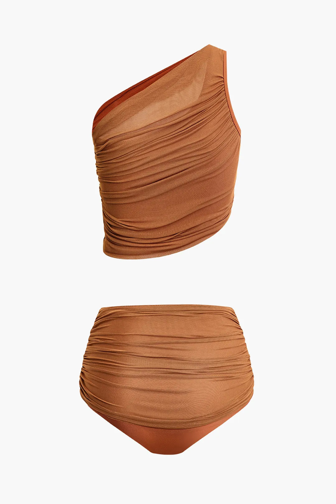 Chala Brown Asymmetrical Ruched Sleeveless Mesh Swimsuit