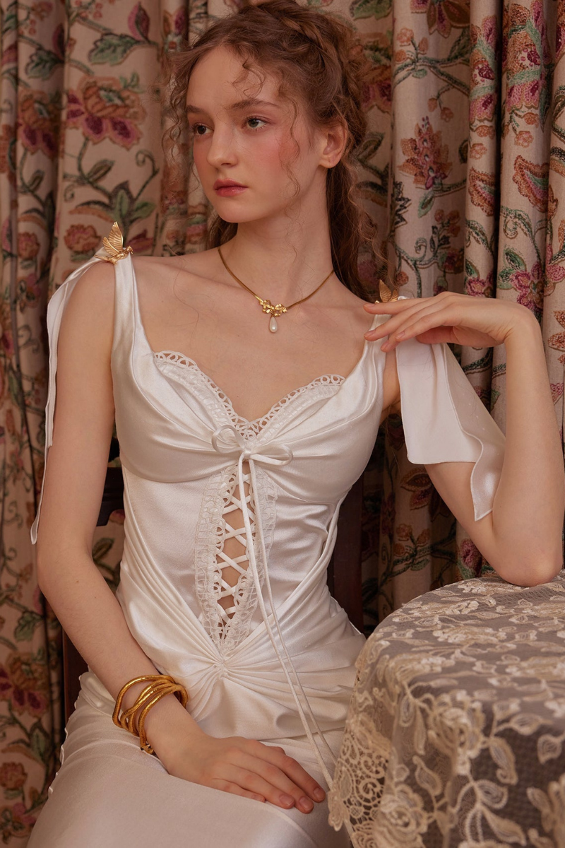 This vintage-inspired Roman mythos knit dress embodies a unique blend of elegance and allure. The shimmering pearlescent finish adds a touch of glamour, while the structured boning provides a flattering silhouette that highlights your curves.