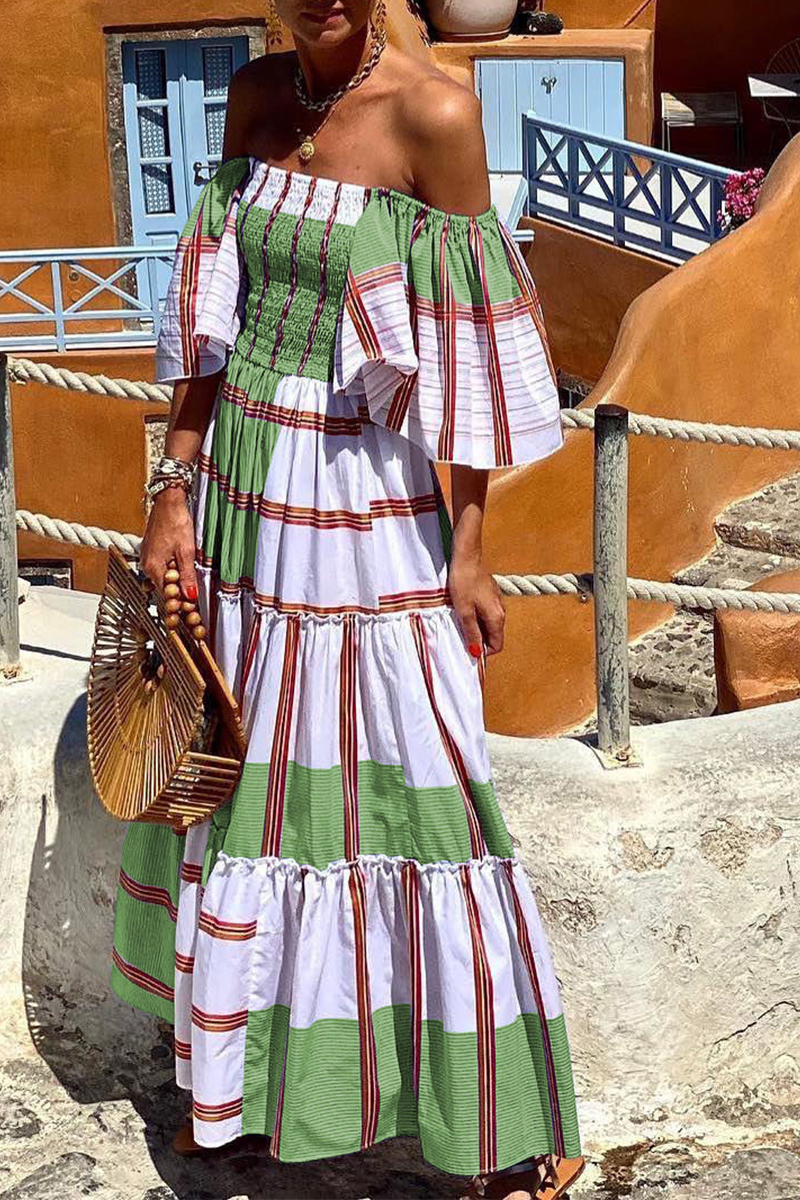 Fashion Print Patchwork Off the Shoulder Cake Skirt Dresses(3 Colors)