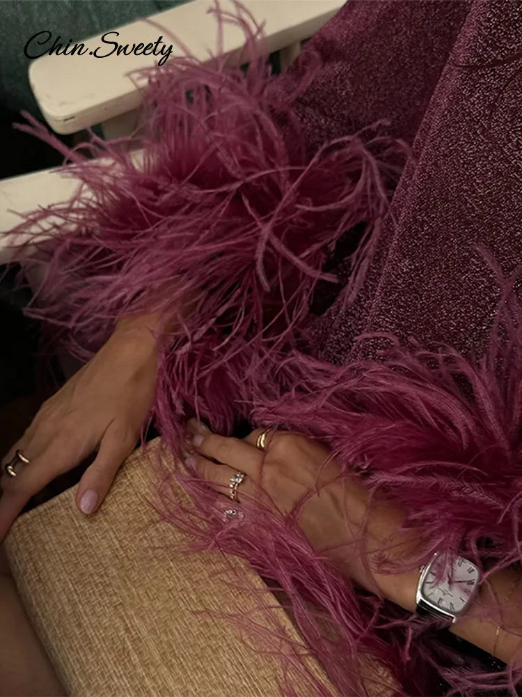 Glitter Feather Oversize Shirt Women Fashion Sparkle Stand Collar Single-breasted Long Flare Sleeve Blouse Lady Y2K Outwear