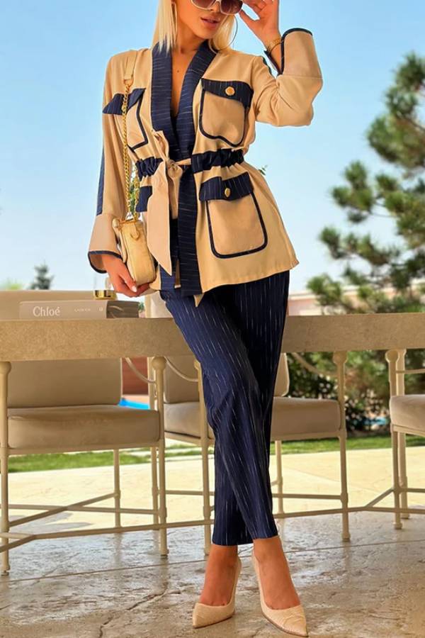 Halston Patchwork Drawstring Flap Pocket Top and Striped Elastic Waist Loose Pants Set