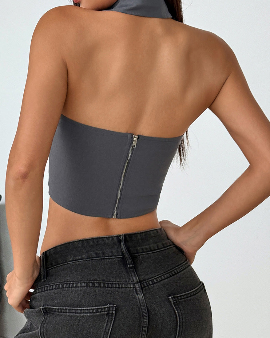 Halter Neck Leopard Print Tie-Strap Herringbone Vest