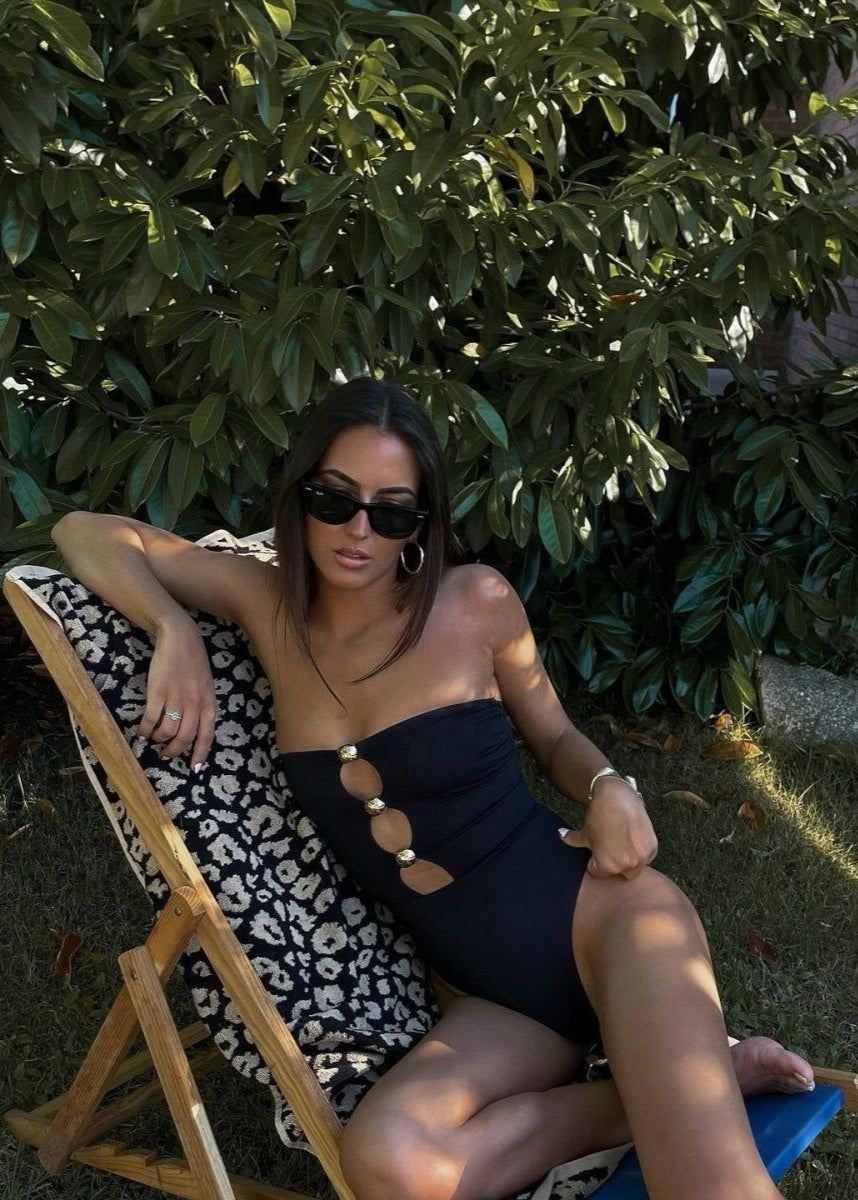The Isla Bandeau Ring One-Piece Swimsuit blends sophistication with a bold beachside statement. Crafted from a smooth and supportive nylon blend, it features a strapless bandeau cut with three gleaming gold-tone rings that create a flattering keyhole design along the front. The structured fit and high-cut leg elongate the silhouette, while the secure construction ensures confident wear whether poolside or on the sand.