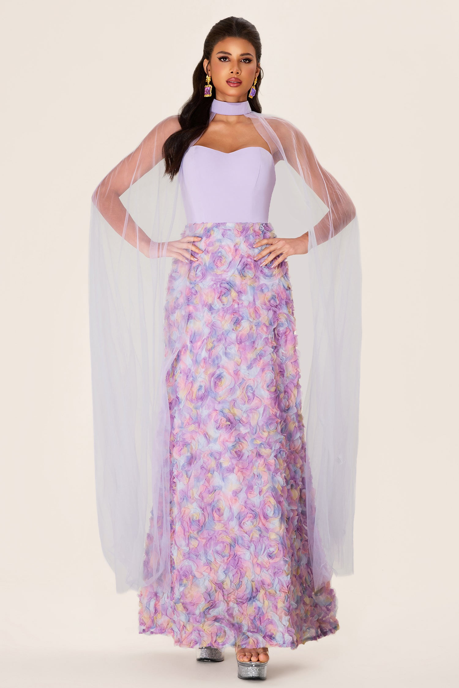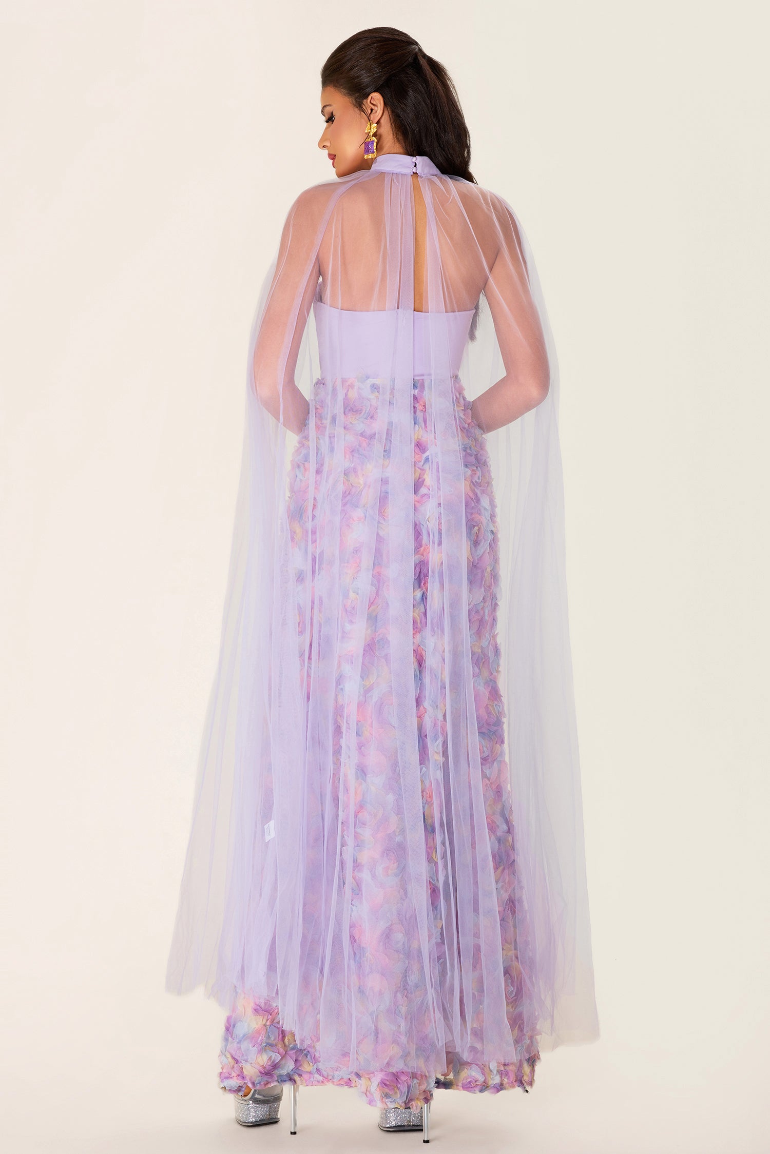 - Sleeveless, solid color, lavender, cape, maxi dress