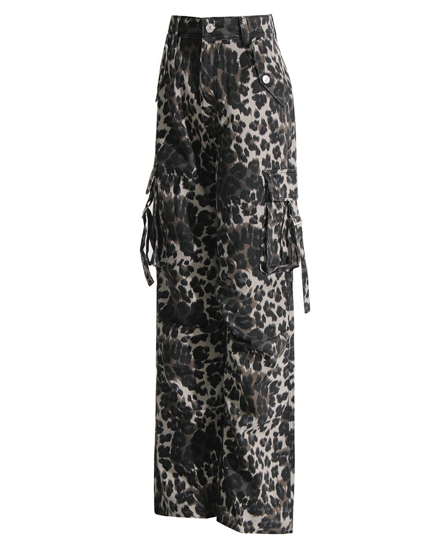 Product Description: Leopard Print High Waist Straight Cargo Pants (With Pockets) Jeans