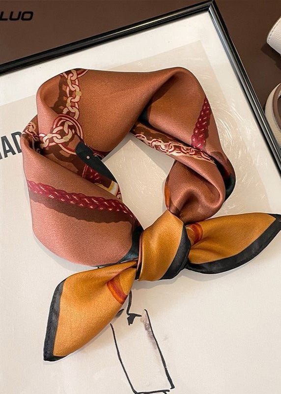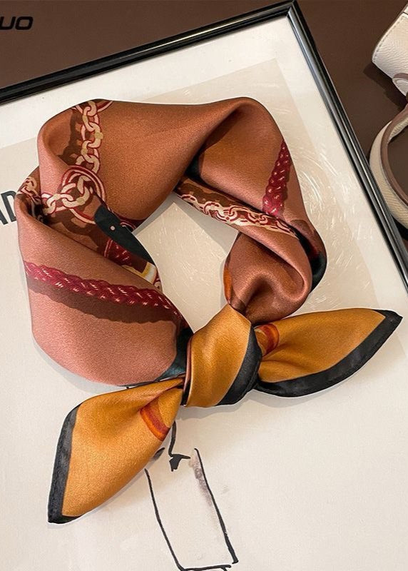 The Marcelline Chain Print Scarf brings timeless equestrian elegance to your wardrobe. Crafted from glossy imitation silk, this compact 53×53 cm square scarf features an intricate print of bridles, chains, and leather straps in warm earthy tones. Perfect for tying around the neck, wrist, or handbag handle, it adds a luxurious touch to any outfit with its rich pattern and silky texture. Lightweight and smooth, this scarf blends classic design with versatile styling potential.