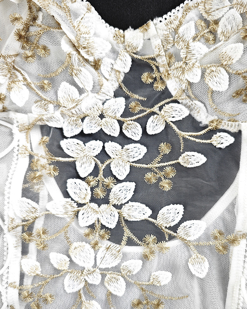 Mesh Embroidered Sexy Lace Transparent Backless Drawstring Bodysuit