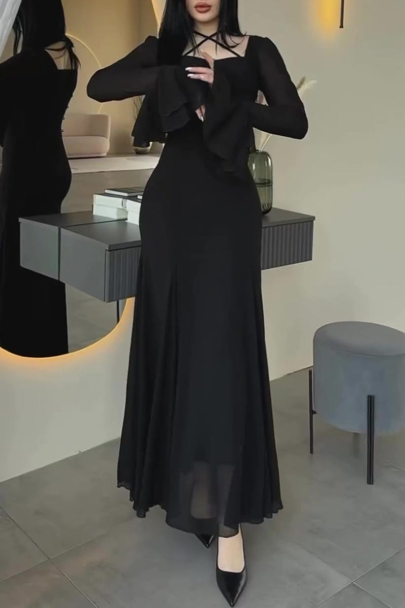 Party Elegant Ruffle Cross Straps Ruched Mesh Square Neck Long Dresses