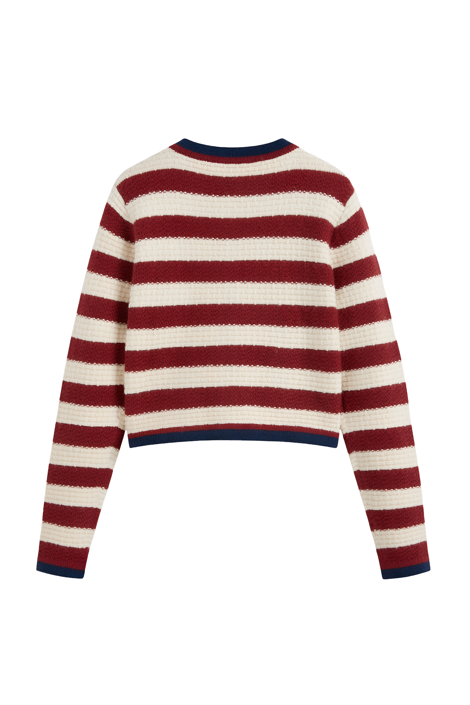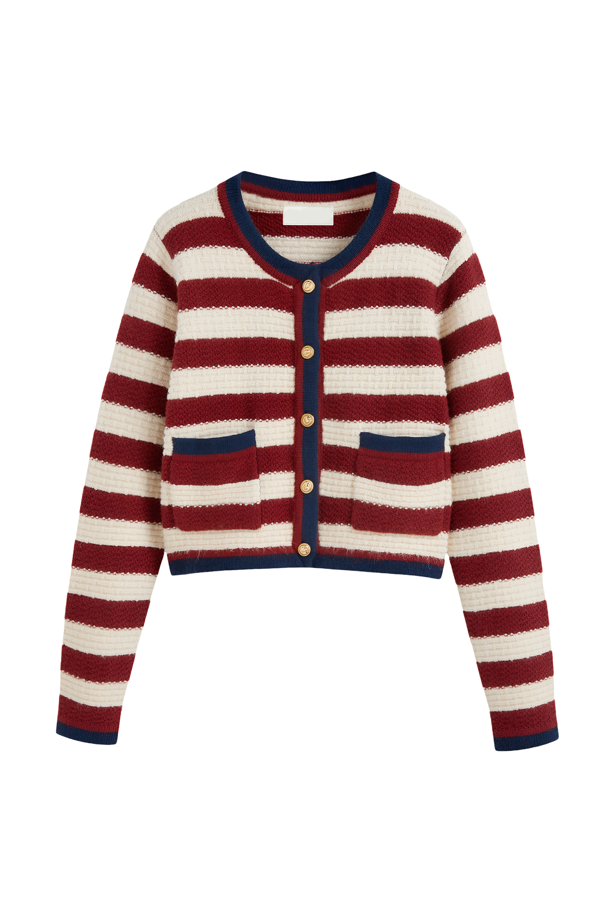 Elevate your style with our button-up knit cardigan, designed with a classic round neckline and a chic mid-length cut. The striking red stripes add a bold touch, making this piece a versatile addition to your wardrobe.