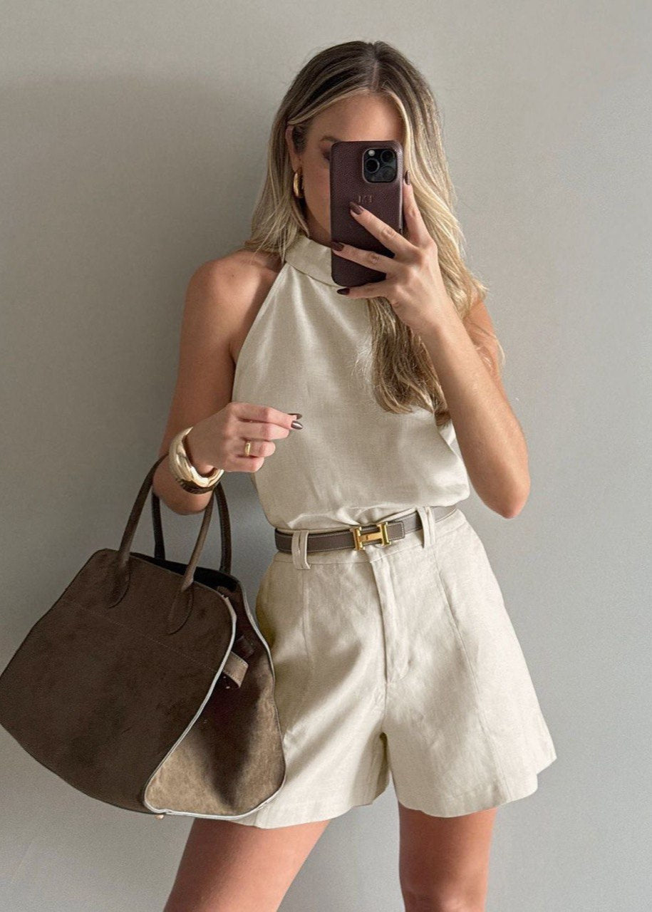 The Sahara Halter Linen-Blend Shorts Set combines crisp tailoring with breathable comfort. Crafted from a lightweight blend of 55% linen and 45% cotton, this two-piece features a sleeveless halter-neck top with a soft stand collar and an open back, paired with structured high-waisted shorts. The natural texture and refined silhouette make it ideal for brunch dates, seaside strolls, or warm-weather evenings.