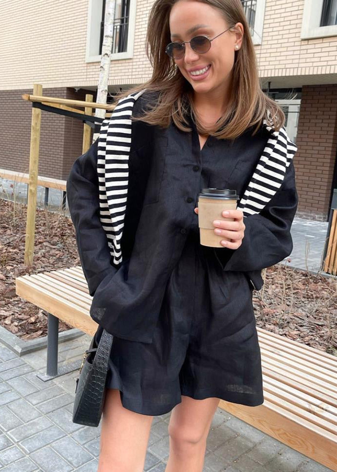 The Solea Linen Set offers laid-back sophistication with a coastal vibe. Made from a breathable linen-blend fabric, this two-piece ensemble features a relaxed-fit button-down shirt with a sharp collar, wide sleeves, and dual front pockets. The matching shorts have a softly structured silhouette with a high-rise elastic waistband and comfortable length. Designed for effortless styling on sunny days, this set is ideal for warm getaways, resort looks, or easygoing city wear.