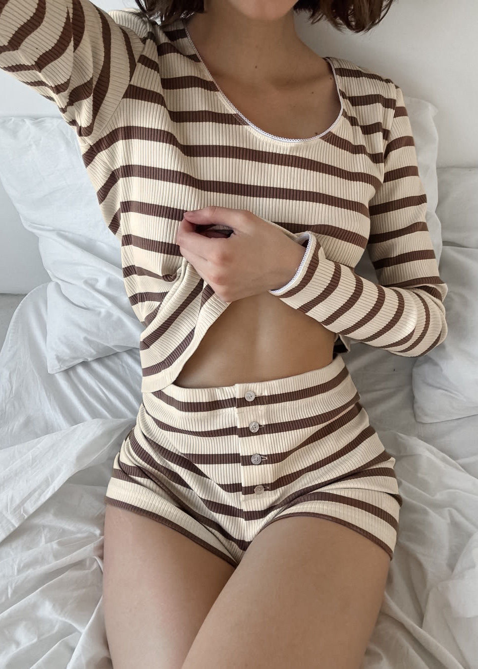 Striped Long Sleeve Top and Button-Front Shorts Set offers a cozy yet stylish option for lounging or casual outings. The top features a scoop neckline and fitted long sleeves, while the high-waisted shorts are detailed with a button-front design for added charm. Crafted from a soft, ribbed fabric, this set ensures comfort with a touch of playful style.