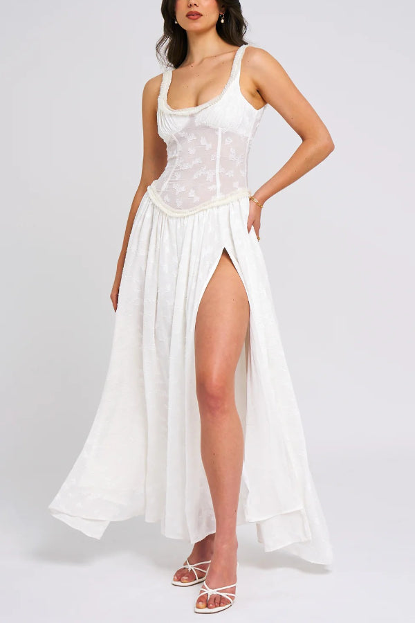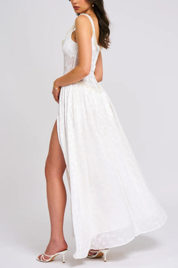 Ulissa Light Green Square Neck Jacquard Textured High Slit Maxi Dress