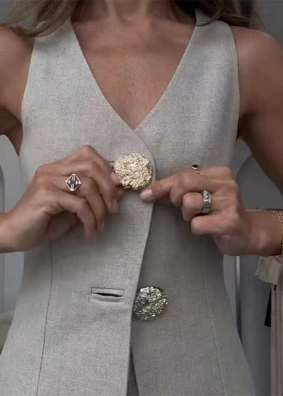 The Valette Wide-Leg Set offers a refined balance of structure and soft tailoring. Crafted from a breathable linen-cotton blend, this sleeveless vest and pants combo features sculptural golden buttons that add a distinctive focal point. The tailored vest showcases a clean V-neckline and flattering silhouette, while the wide-leg trousers offer fluid movement and a relaxed waist. Ideal for both business casual and city chic outfits, this set delivers a sophisticated aesthetic with a modern edge.