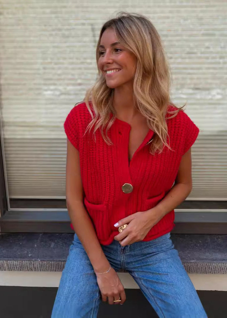 Verona Charm - Chunky Knit Vest brings timeless sophistication to modern layering. Designed with a rich textuRed knit, this sleeveless vest offers warmth and structure without bulk. The bold button closures and front pockets add a touch of elegance, while the relaxed silhouette makes it easy to style over blouses, turtlenecks, or casual tees. Perfect for transitional weather, this versatile knitwear piece effortlessly blends comfort with a refined, statement-making look.