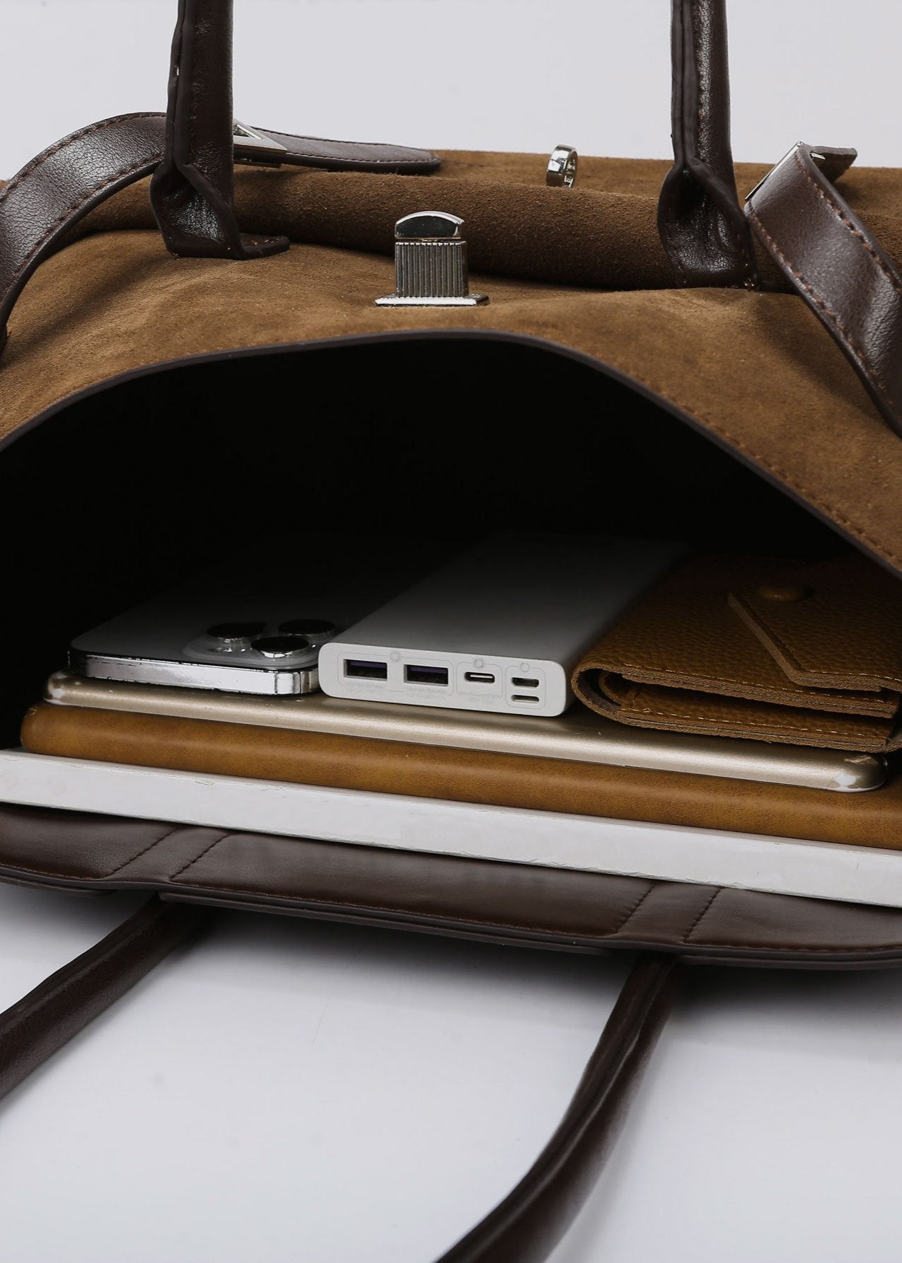 The Vintage Leather Suede Tote Bag blends classic sophistication with practical design. Featuring a two-tone leather and suede finish, it adds a timeless touch to any outfit. With dimensions of 35.5cm (width) x 29cm (height) x 11.5cm (depth), this bag is spacious enough to hold daily essentials while maintaining its sleek appearance. Double handles ensure comfortable carrying, making it perfect for work, travel, or stylish outings.