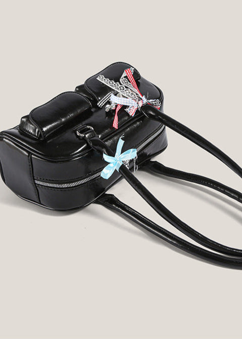 Violetta – Patent Shoulder Bag with Double Pocket & Ribbon Charms delivers retro attitude with a playful finish. This compact structured shoulder bag features a glossy patent leather texture, accented with front flap pockets and contrasting bow and chain charms. Designed for on-the-go essentials, it includes a secure zip-top closure and mid-length double handles that fit comfortably over the shoulder.