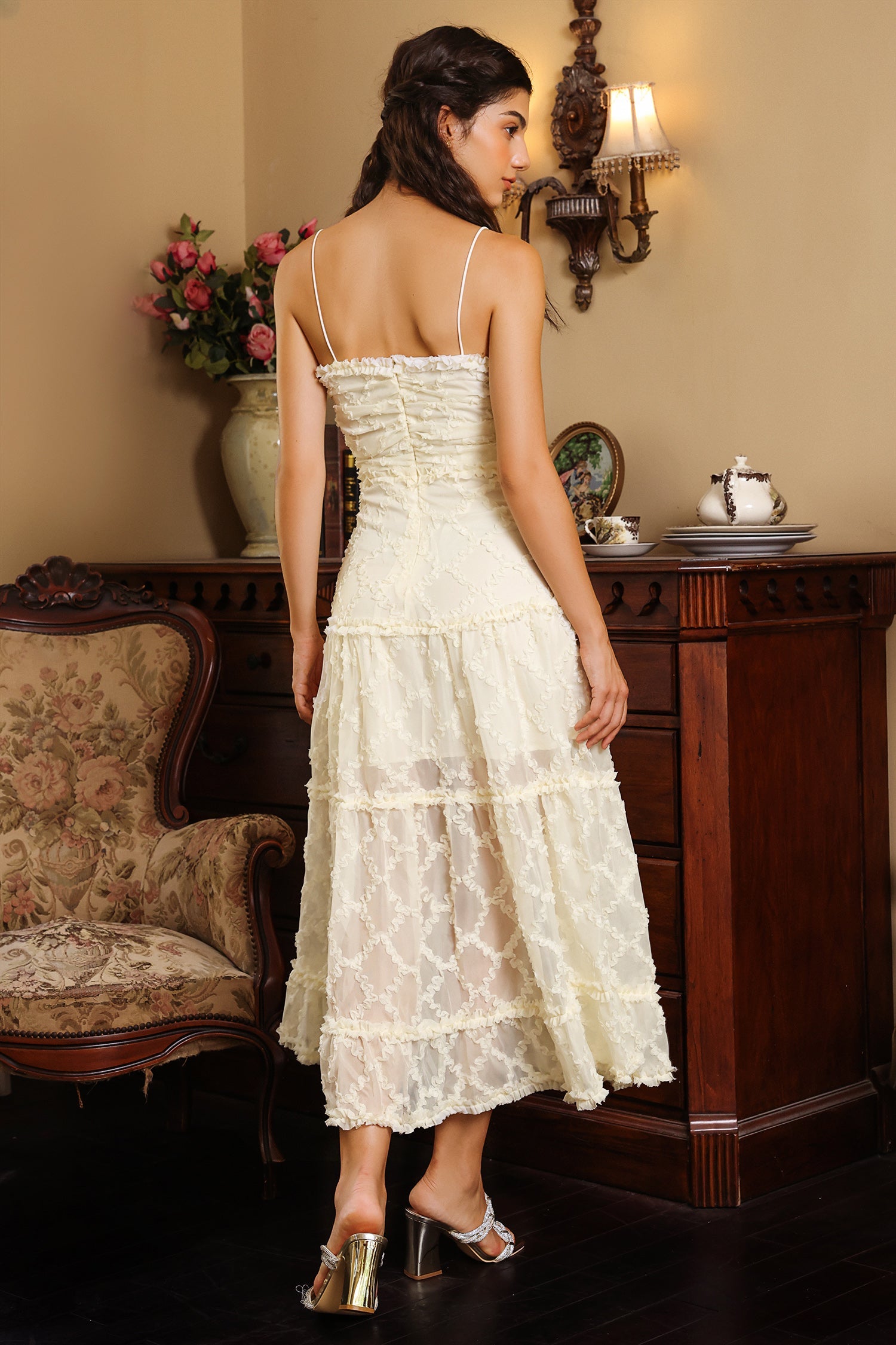 Cami Ruffle Pleated Midi Dress White