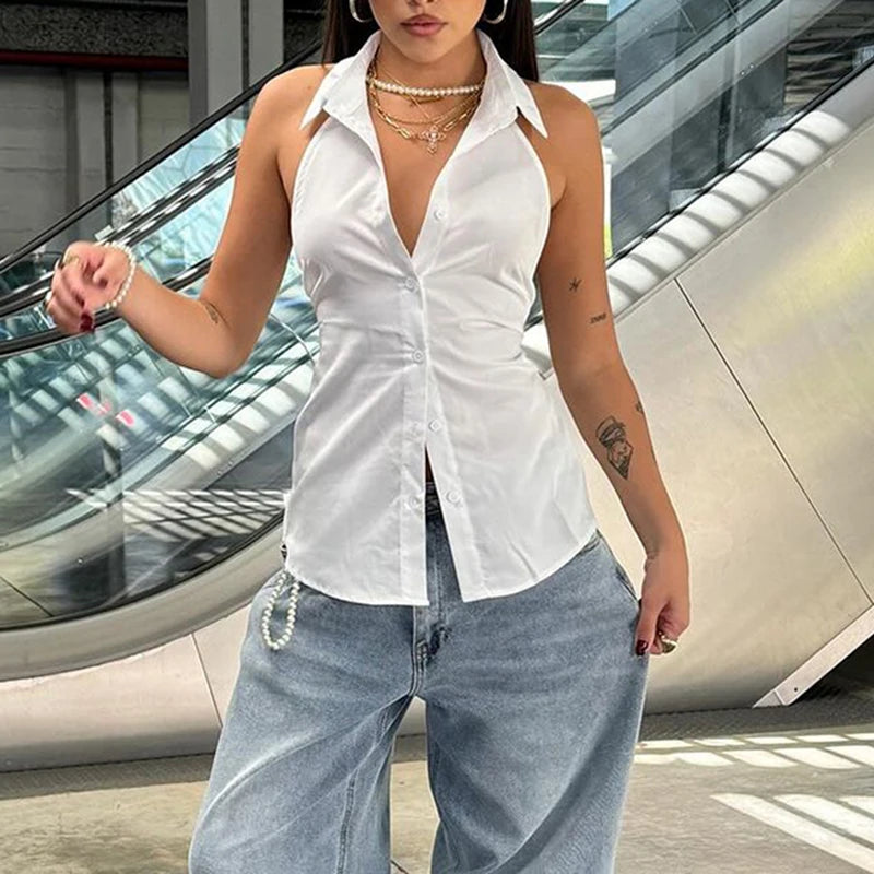 Women Sexy Backless Lace-up Shirt Vest White Halter Sleeveless Turndown Collar Buttons Tank Top Stylish Chic Outfits