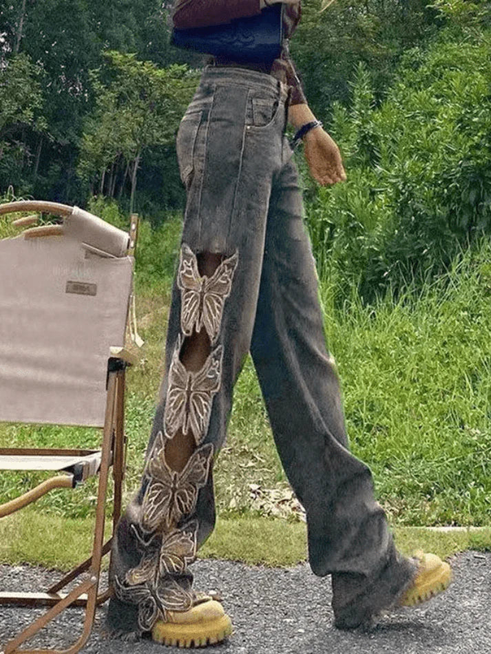 Y2K Butterfly Embroidered Ripped Baggy Ripped Jeans