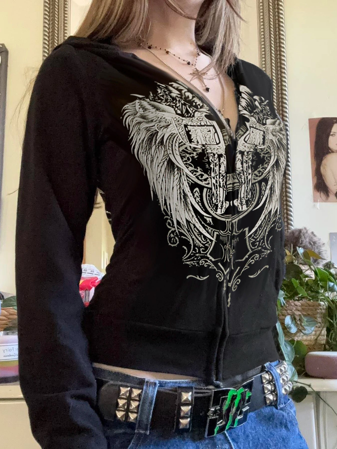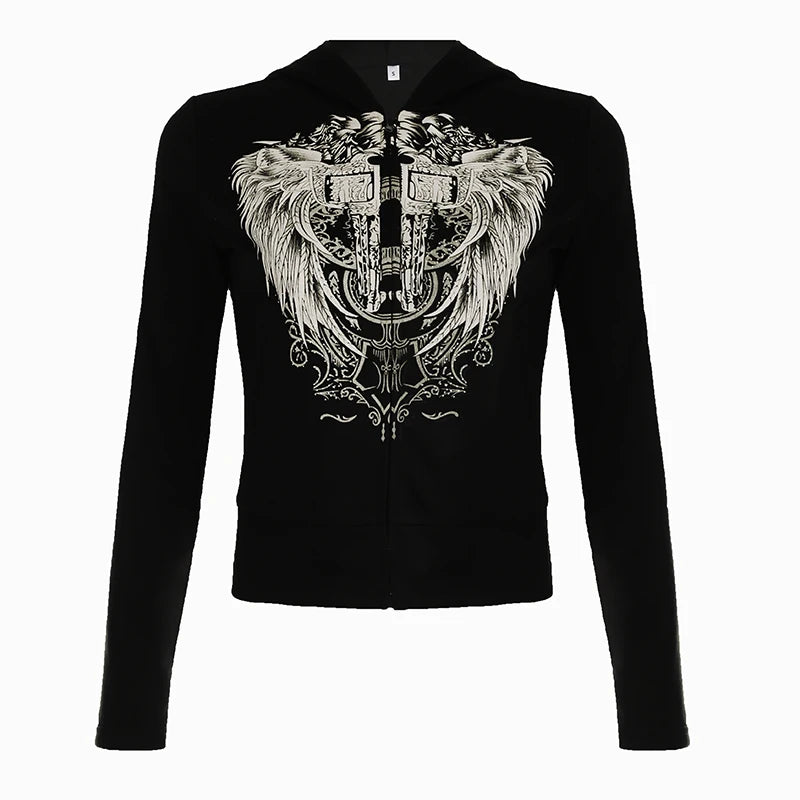 Y2k Darkly Retro Zip Up Hooded Coat Long Sleeve Basic Women s Fashion Chic Diamonds Print Sweats Cardigan